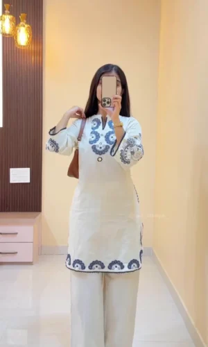 Elegant White Ethnic Co-ord Set with Embroidered Kurti and Flared Palazzo Pants