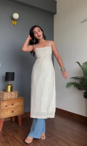 Chic Sleeveless White Cotton Kurti with Side Slits and Round Neckline