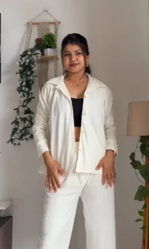 Elegant White Linen Co-ord Set with Oversized Shirt and High-Waist Trousers
