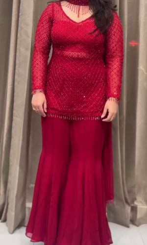 Designer Red Sequin Embroidered Georgette Sharara Suit Set for Women with Net Dupatta – Elegant Party Wear Traditional Indian Ethnic Ensemble with Full Sleeve Beaded Kurti and Flared Palazzo Pants – Festive & Wedding Collection