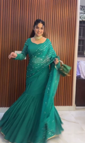 Trendy Rama Green color Sequins Embellished Pre-Stitched Ready to Wear Party Wear Saree Saree with Designer Blouse for Women – Elegant Indian Traditional Outfit for Wedding, Reception & Festive Celebrations