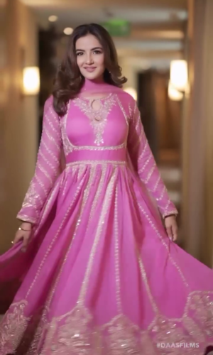 Designer Pink Anarkali Gown with Golden Embroidery – Full-Length Flared Ethnic Dress with Sheer Dupatta and Intricate Sequin Work – Elegant Traditional Indian Party Wear for Women – Perfect for Weddings, Receptions, and Festive Celebrations