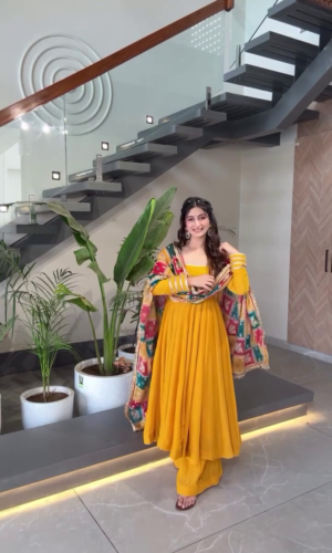 Radiant Mustard Yellow Georgette Anarkali Suit Set with Multicolor Phulkari-Inspired Dupatta, Intricate Gota Patti Detailing, and Traditional Ethnic Embroidery – Elegant Festive and Wedding Wear for Women