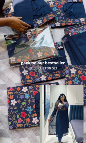 Elegant Navy Blue Chiffon Kurta Set with Multicolor Floral Yoke Design – Lightweight Ethnic Suit for Women with Printed Dupatta and Sleeves, Perfect for Everyday Wear, Office, and Casual Outings